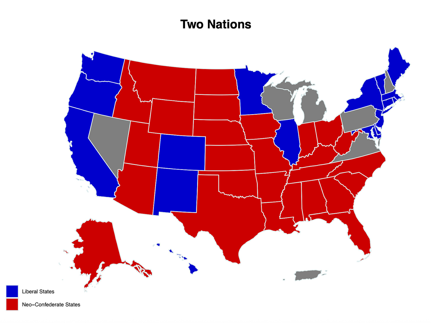 Today, that resurgence of unfettered capitalism—compounded by a generation of failed leadership—has unfolded along divergent paths in what I will call the Neo-Confederate States and the Liberal States.3 We casually label them “red” and “blue,” but doing so makes the mistake of attributing the divide to the policy, marketing or branding choices made by each party.
