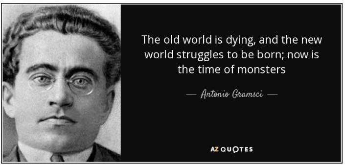 A century ago, in a time with many similarities to our own, Antonio Gramsci recognized that: The old world is dying, and the new world struggles to be born: now is the time of monsters. Then, as now, the shambles left by unchecked capitalism and a generation of failed leadership fueled catastrophic alternatives: Soviet totalitarianism on one side, and on the other the fascist axis of Germany, Italy, Spain, and Japan. But that outcome was not inevitable. In the United States, the New Deal prevailed despite substantial sympathy for fascist movements at home.