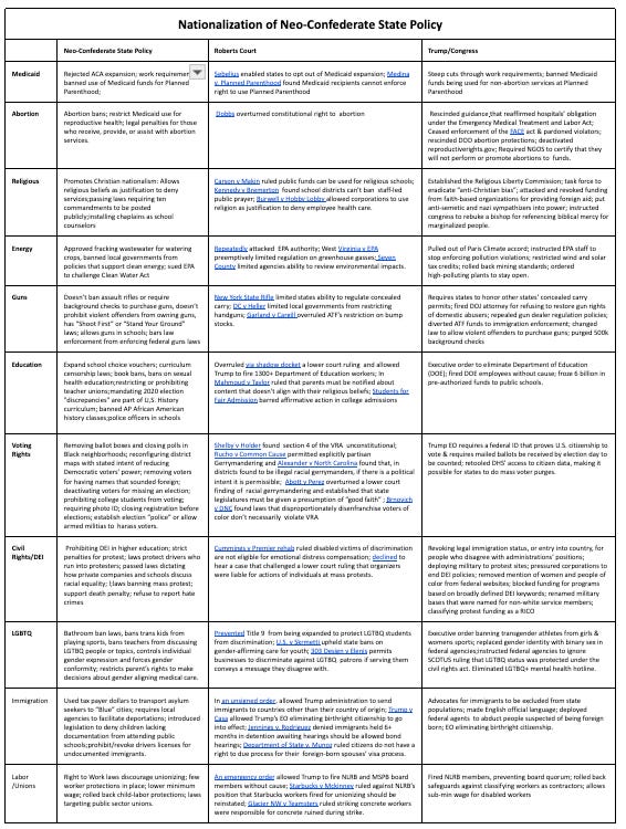 Much of Project 2025 was less the product of the imagination of DC think tankers than a compendium of what Neo-Confederate states have already enacted within their borders. Those states continue to be “laboratories of autocracy” supplying the Trump regime with the tested and honed policies and personnel that were lacking in Trump 1.0.
